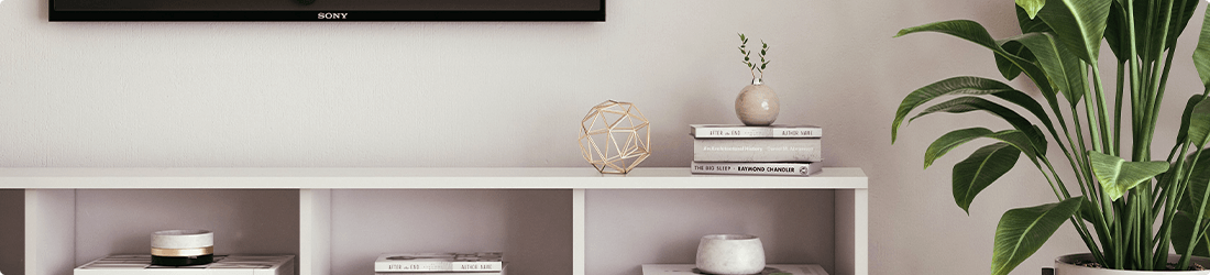 Mange spør om det er ok at TV-en er bredere enn benken. Svaret er nei, sørg for at benken er større, for å beskytte TV-en mot å velte. Vær også oppmerksom på hylledybden, da den må gi nok plass til TVen din og ekstrautstyr. Foruten sikkerhet, er mer lagringsplass en annen fordel et større stativ tilbyr. Legg til noen dekorasjoner, et ofte brukt triks for å integrere teknologi i koselig interiørdesign.
