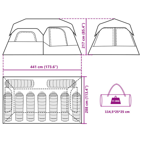 • Mål telt: 441 x 288 x 217 cm (L x B x H)