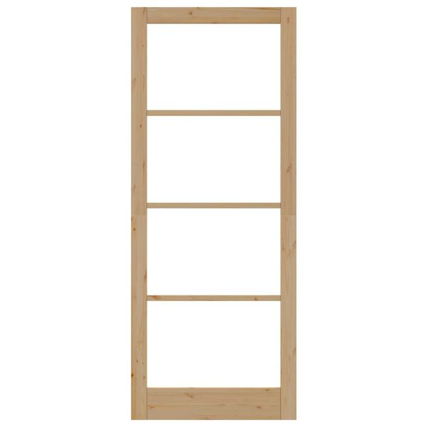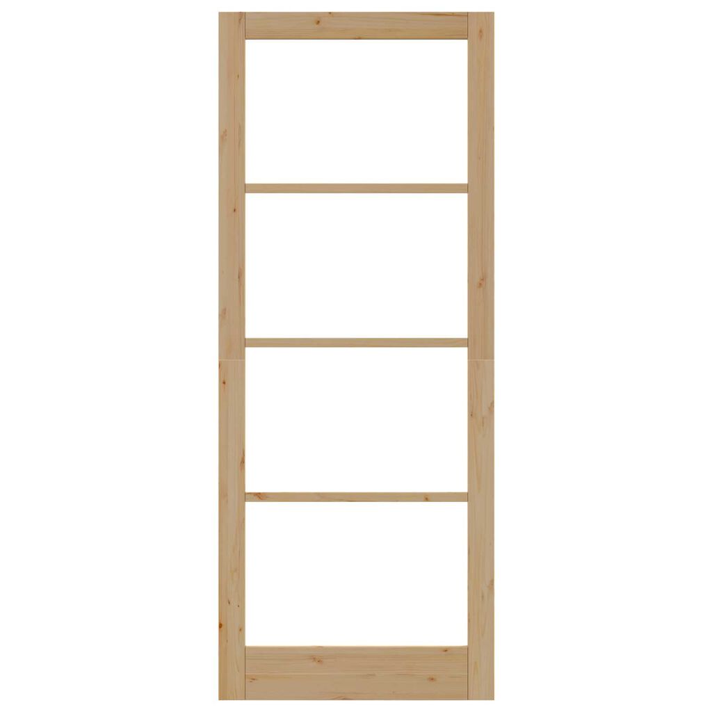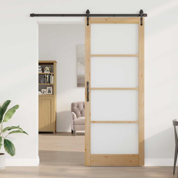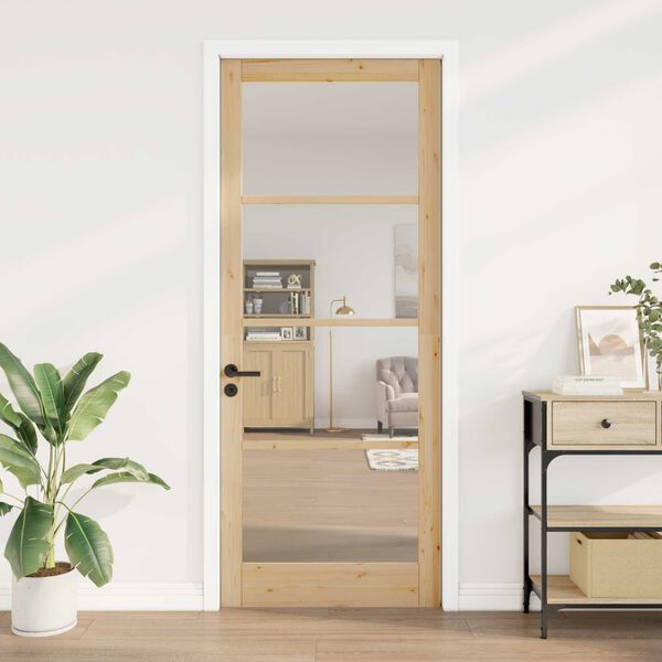 Denne innedøra med glass, laget av solid furutre og glasspaneler, passer perfekt inn i enhver moderne leilighet. Den slanke rektangulære formen og kombinasjonen av materialer bidrar til å lyse opp rommet med en fresh og stilig atmosfære. Du kan bruke den som en kul skillevegg som slipper inn naturlig lys og gir liv til rommet.