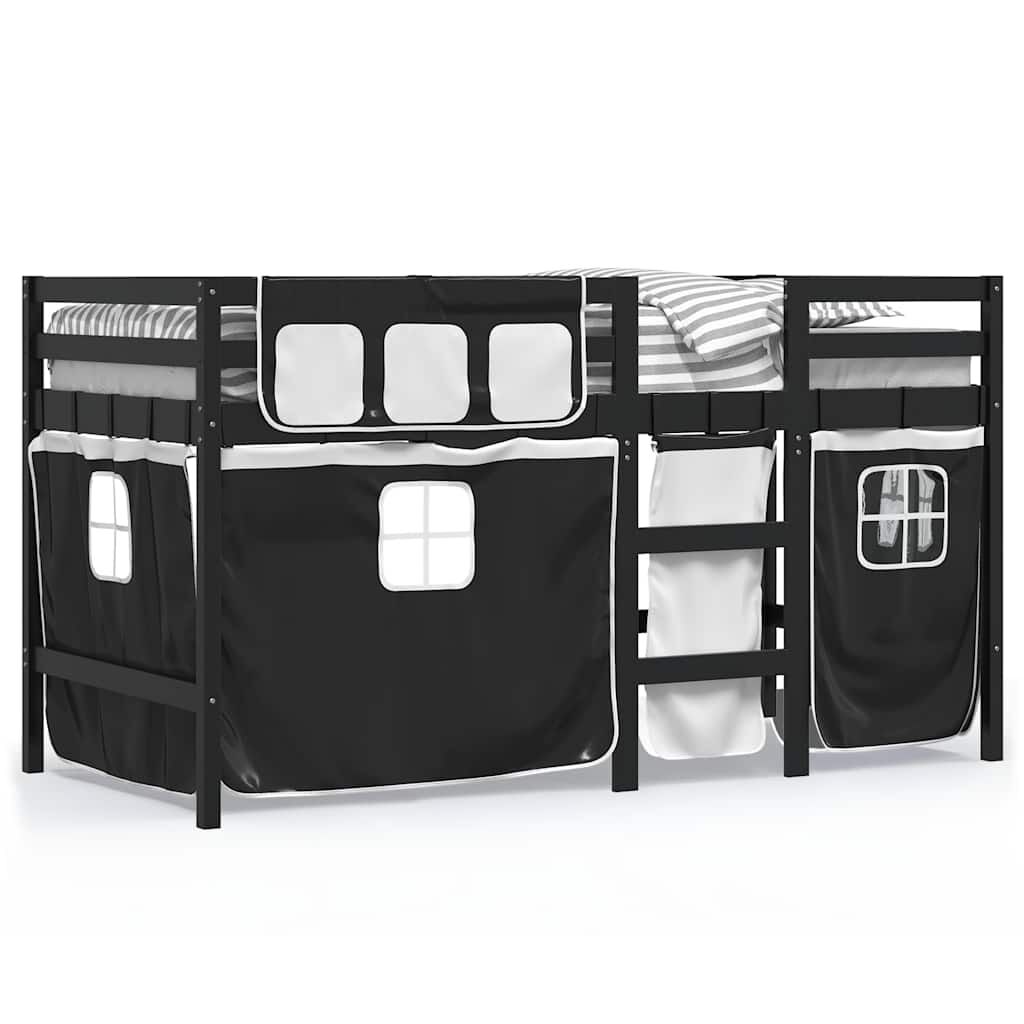 vidaXL Køyeseng for barn gardiner hvit og svart 90x190 cm heltre furu
