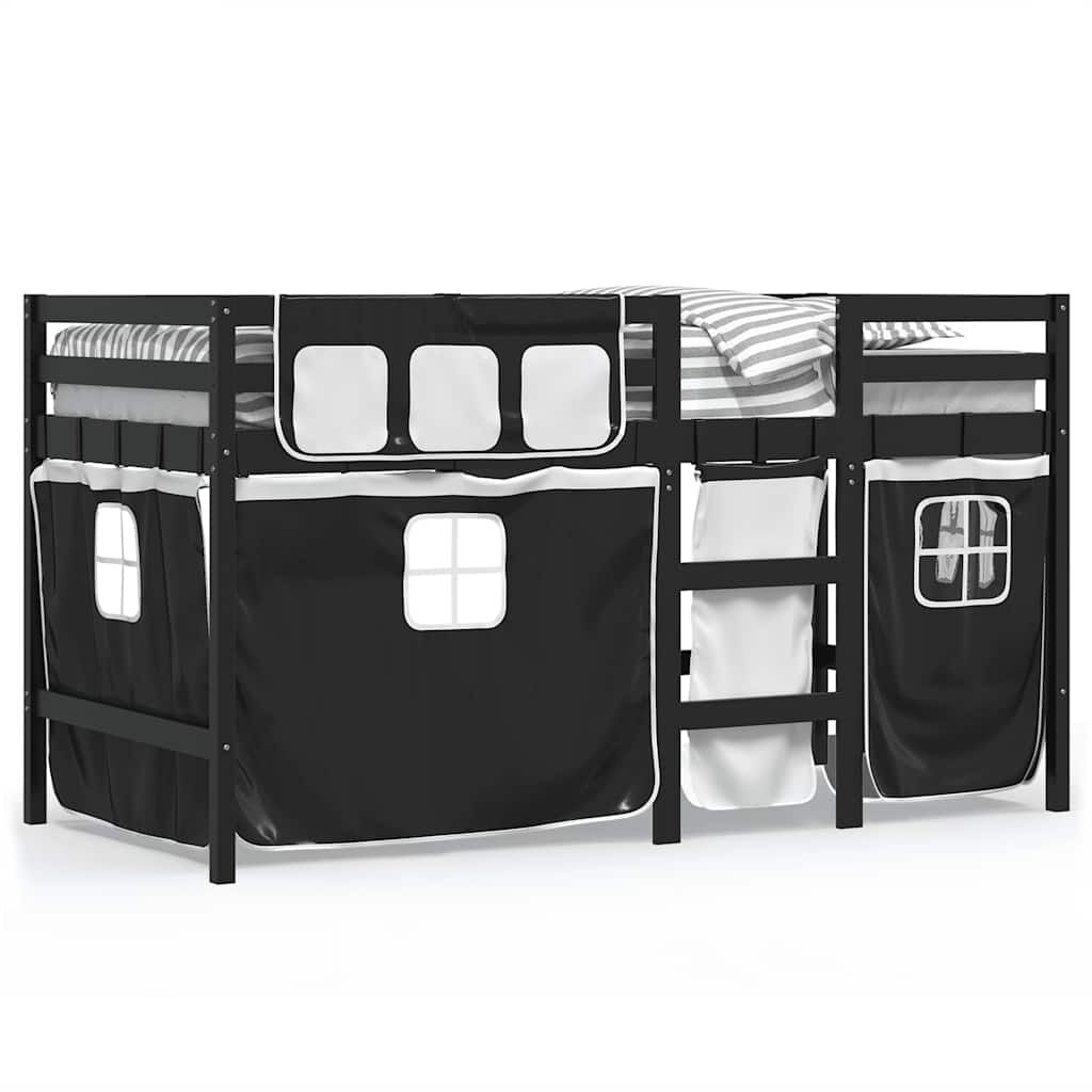 vidaXL Køyeseng for barn gardiner hvit og svart 90x200 cm heltre furu