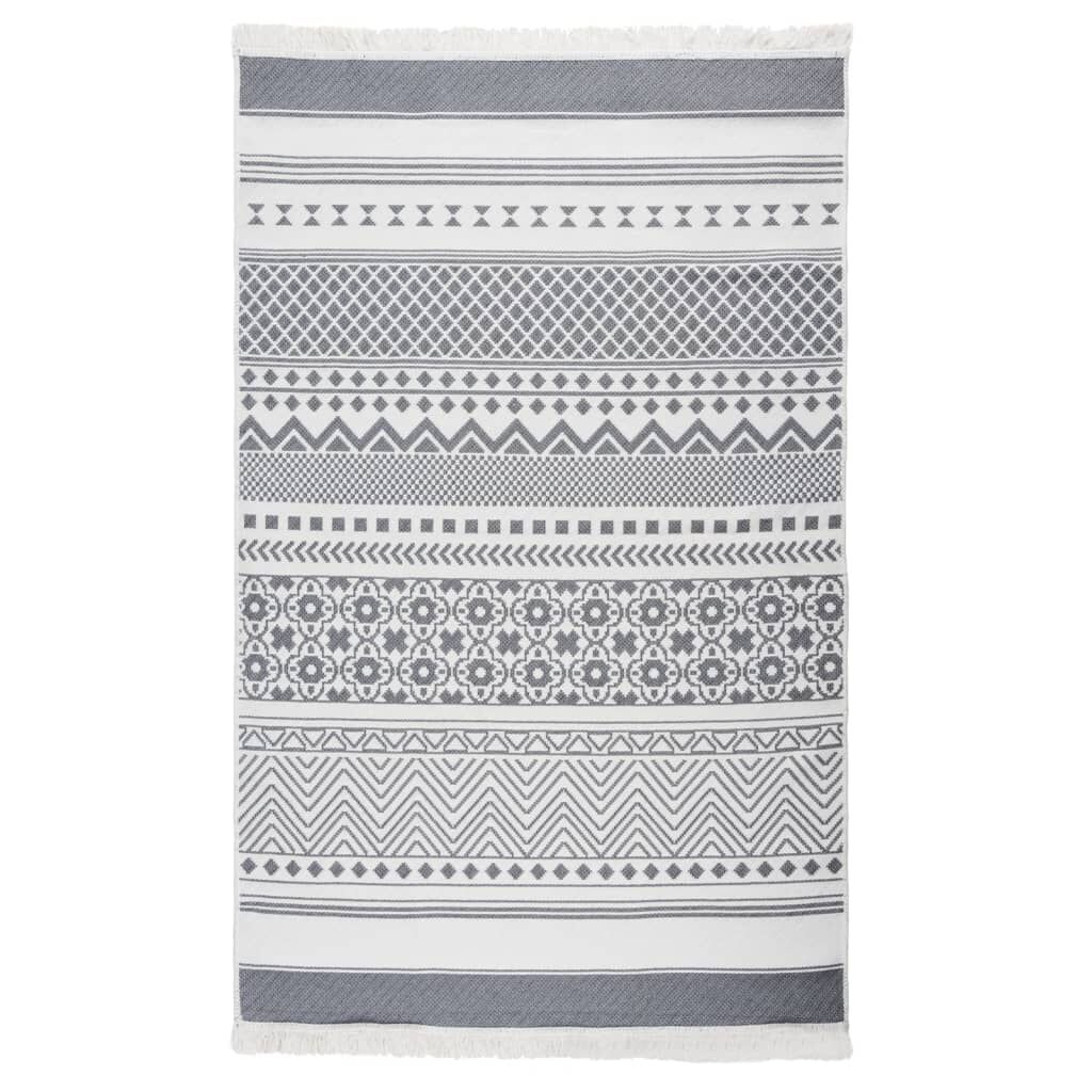 Dette gulvteppet er laget av 100 % bomull, og er behagelig å gå på barbeint. Dette innendørs teppet kan vaskes i vaskemaskin ved 30 °C i anbefalt syklus "Delikat". Dette teppet er vendbart, noe som betyr at det kan brukes på begge sider. Dessuten kan det også tjene som et pledd for å ta en lur.