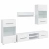 Dette settet inneholder et veggmontert skap, et gulvstående skap, to tv-benker og en veggmontert hylle, og vil gi mye plass til å sette dine multimediaprodukter, bøker og andre type smågjenstander. Den er også ideell til å plassere dekorative gjenstander, fotorammer, eller til og med potteplanter på. TV-benken har dører du kan dra ned og gir god plass til å kunne organisere bøker, DVD-spillere, mediaprodukter, osv. på en enkel og organisert måte. Veggskapet og det gulvstående skapet er utstyrt med glassdører og tre hyller, hvorav en av de er en glasshylle med energisparende, hvitt LED-lys.