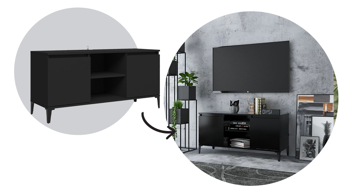 For å skape et ekte industrielt utseende, bruk møbler som kombinerer to av de mest populære industrielle materialene, dvs. tre og metall. Se etter elementer som lett kan fange blikket i rommet. Det kan f.eks. være en svart TV-enhet i tre med metallben og åpne hyller.
