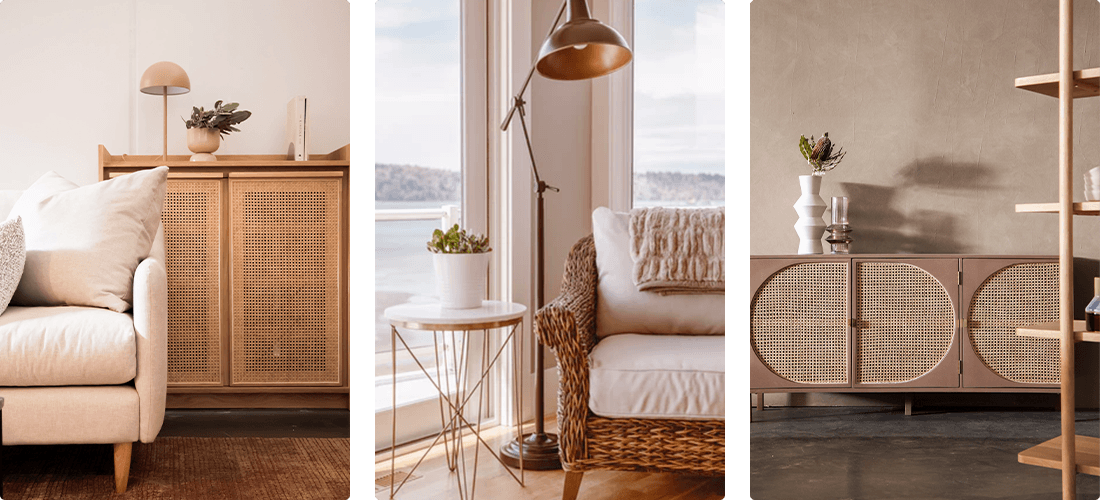 Kurvstrå og rotting-trenden skiller seg ut gjennom allsidighet, og er lett og super holdbar. Kurvstrrå er en type veving, mens rotting i seg selv er et naturlig materiale. I dag brukes ofte syntetisk rotting, som er ganske miljøvennlig. Ved siden av andre naturlige materialer som jute eller bambus, definerer den utsøkte kurvstråen den koselige stemningen du leter etter.