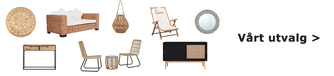 Møblene i kurvstrå og rotting er også et godt valg når man designer et uterom. Dt skaper et harmonisk område som balanserer det livlige uteområdet med det koselige innerommet. Velg utemøbler i rotting for å spise eller slappe av. Velg noen puter eller stilige kasteputer for et skvett av farge og ekstra komfort.