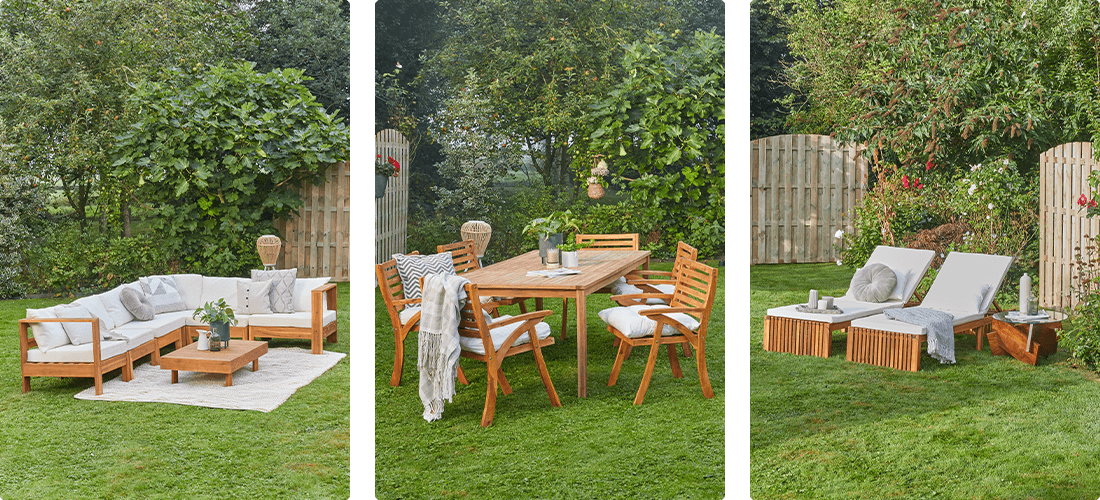 Allsidigheten til hagemøblene i tre gjør at du kan style dem på forskjellige måter. For eksempel er vårt spisebord i heltre teak perfekt for å nyte måltider utendørs. Gjør det mer behagelig ved å legge til noen myke puter i favorittfargen din.