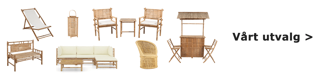 Hvis du vil at uteområdet ditt skal se ut og føles som en avslappende himmel, er hagemøbler i bambus det perfekte valget. Vi har møbleringsløsninger for alle rom, fra en koselig balkong til en stor hage. Dekorer med stil med et par sammenleggbare regissørstoler i bambus – de er trendy og unike. Eller gå for et spisebord i bambus for deilige måltider utendørs.