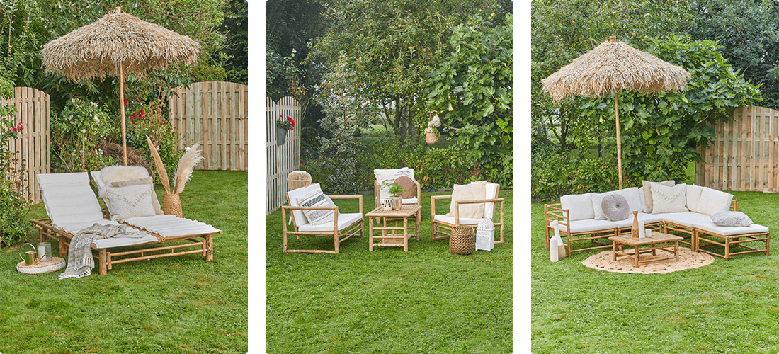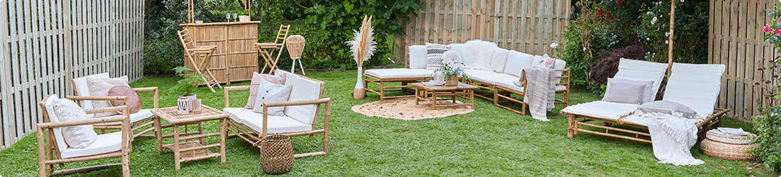 Den tropiske stemningen i hagen din er ikke komplett uten mange planter - så hvorfor ikke velge en hageseng i bambus med espalier? Du kan til og med avskjerme salongområdet med et bambusgjerde. Det vil skape et koselig og innbydende tilfluktssted. Forfrisk dine bambusmøbler med tepper og puter i naturlige nyanser eller livlige farger, for en bohemsk følelse.