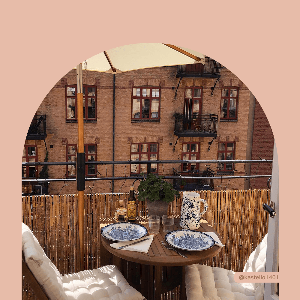 Nyttig tips: Hvis du er velsignet med en balkong, vil du få mest mulig ut av tiden du tilbringer utendørs, uansett vær. For å skjerme deg mot de kraftige UV-strålene og få litt privatliv, anbefaler vi å installere en veggmontert parasoll eller en balkongskjerm. Dessuten vil myke og koselige plagg holde deg varm på de kjølige kveldene uten å tvinge deg til å gå inn, så det kan være lurt å legge dem til balkongpyntelisten også.