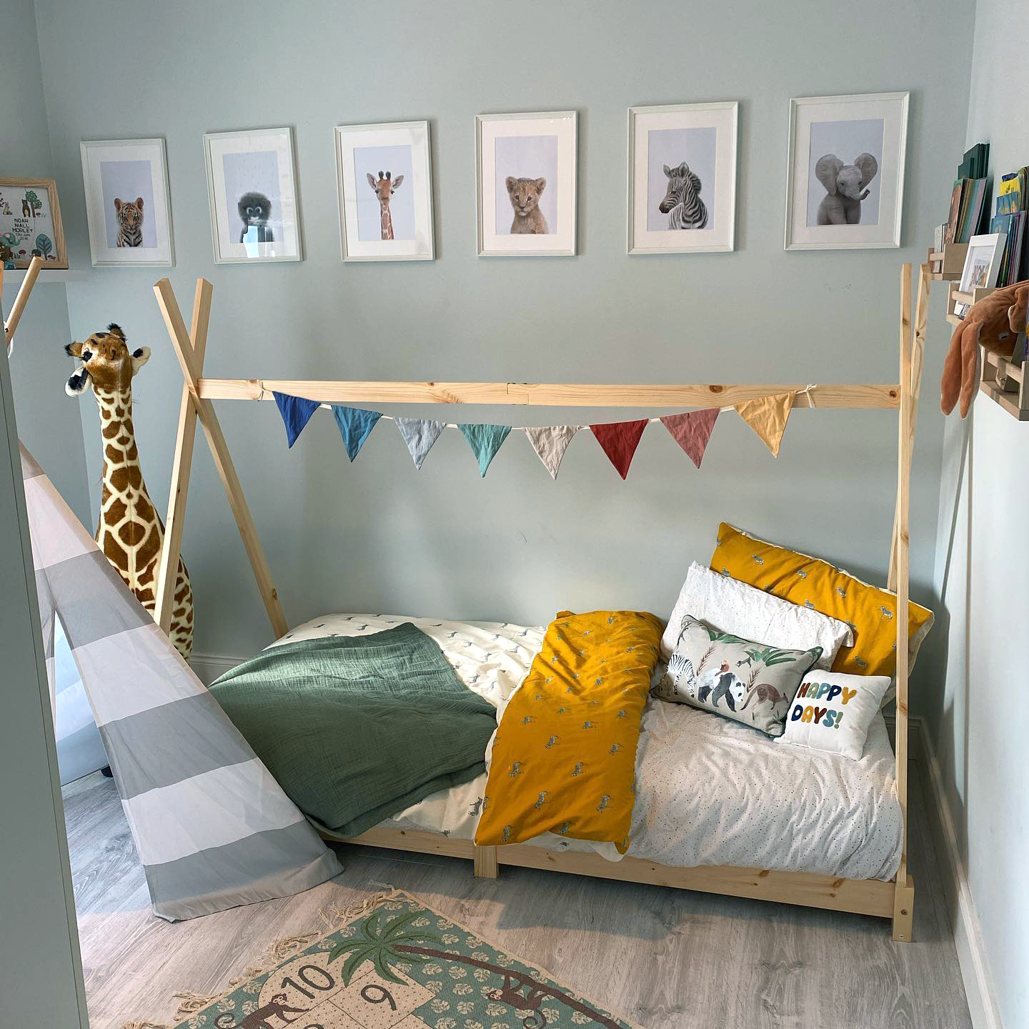 Nevnte vi at mulighetene for å skape fantastisk veggkunst på barnerommet er uendelige? Ta for eksempel de søte og oppfinnsomme kollasjer. Skaff deg noen rammer og heng opp alt barnet liker, fra personlige bilder til naturbilder og favorittfigurer. Du kan også henge opp noen makramé-veggoppheng eller andre hobby-dekorasjoner som du og barnet ditt kan lage sammen for å gi barnerommets veggkunst en varmere stemning.